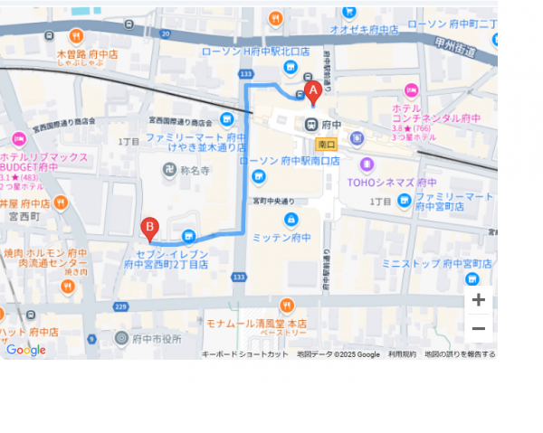 府中駅から府中eyelash&nail Ameriまで、徒歩で約3~6分です。